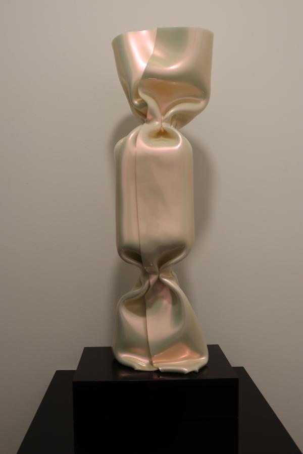 Ses « Wrapping Bonbon » en plexiglas – un irisé radiant de 34 cm, un irisé radiant gaufré de 40 cm et un blanc nacré monumental de 60 cm – captent la lumière nancéienne et la transforment en éclats irisés et reflets nacrés. Ces pièces uniques (2024-2025) dialoguent avec l'héritage artistique lorrain : la texture gaufrée évoque les verres gravés de l'École de Nancy, les transparences rappellent les créations des frères Daum et d'Émile Gallé, tandis que le blanc nacré fait écho à la porcelaine précieuse.